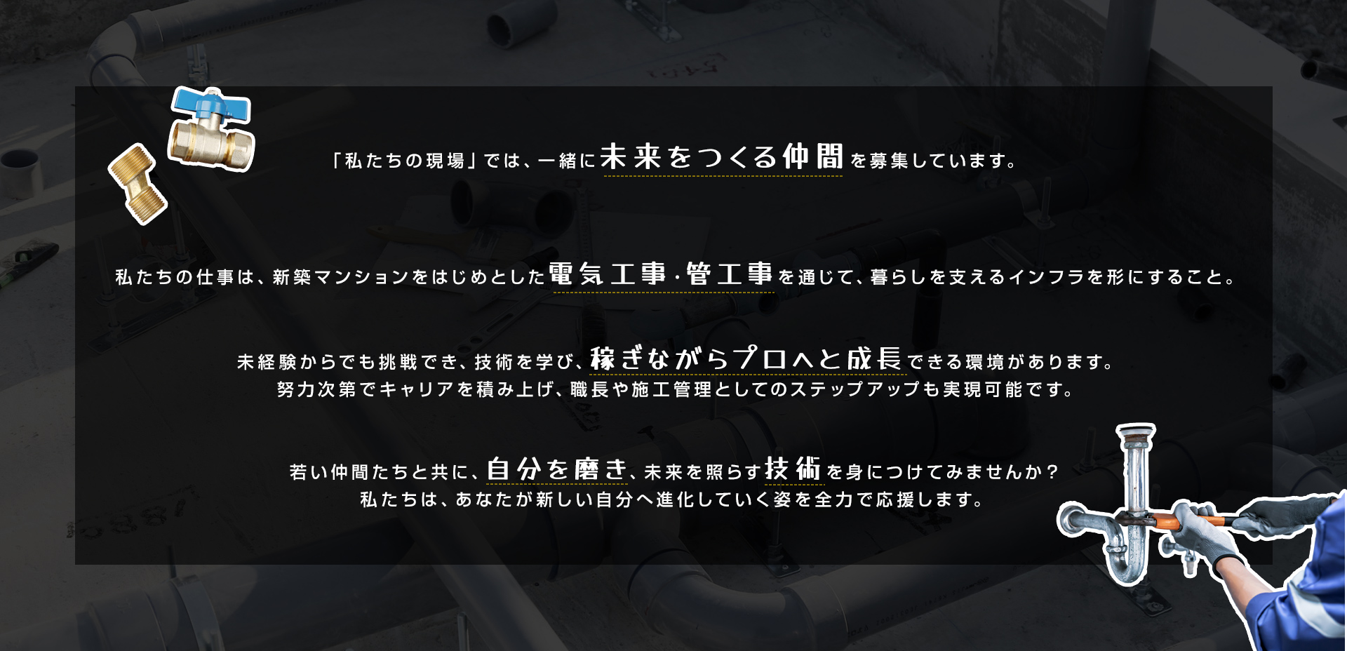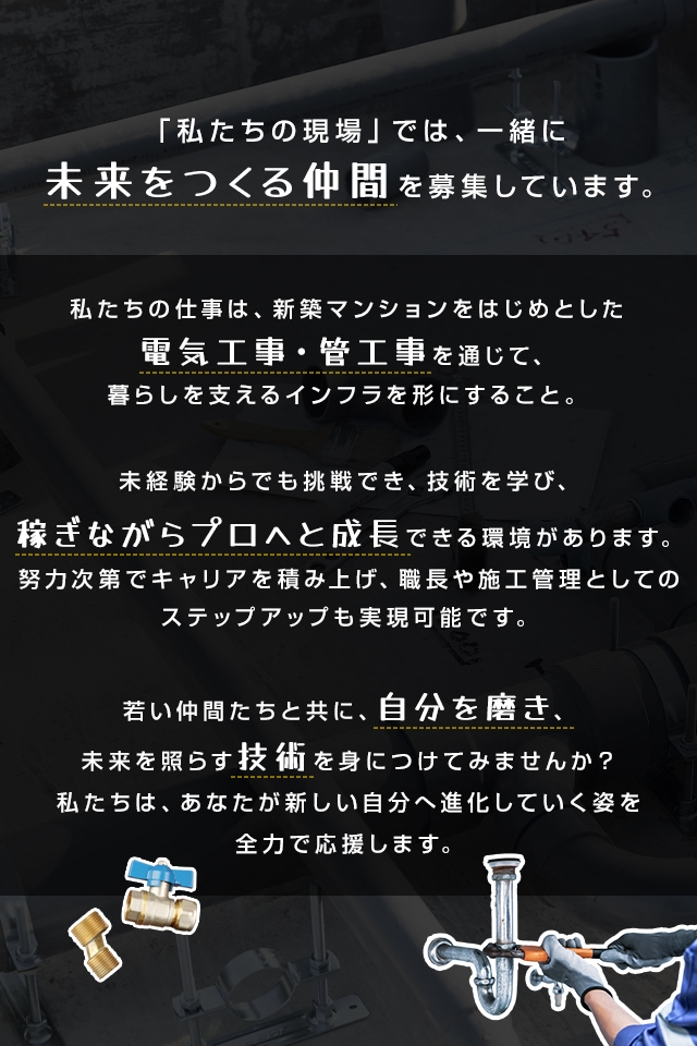 私たちは新築マンションの給排水設備工事・空調配管・衛生設備をはじめ、店舗工事やリフォーム、設備メンテナンスまで幅広く手がけています。
