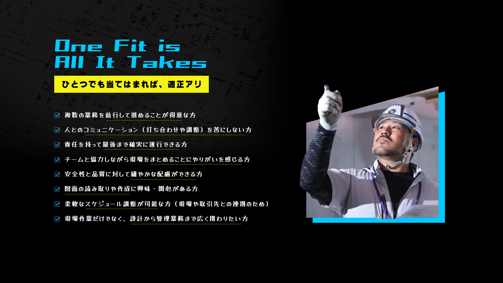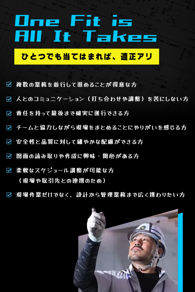CWE株式会社での施工管理は、新築マンションやリフォームの現場で、電気工事・管工事の施工全体を計画・管理する仕事です。現場の安全性や作業品質を確保しながら、工程の進行や人員配置、資材の手配などを統括します。施工図や設計図の確認、工事費用の積算・見積作成、作業スケジュールの調整と現場作業の管理など、多岐にわたる業務を通じて、工事が計画通りに、安全かつ効率的に進むようサポートします。