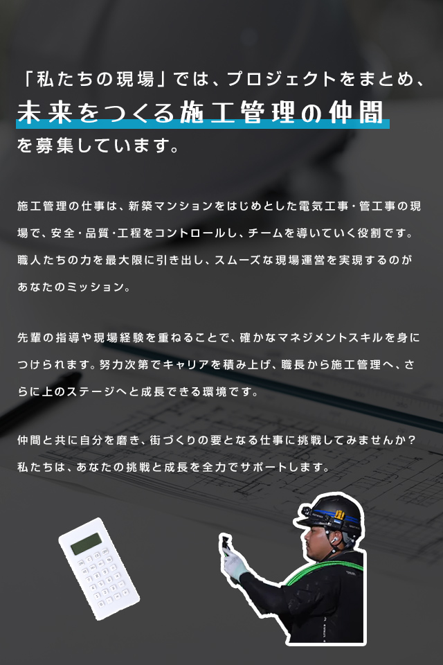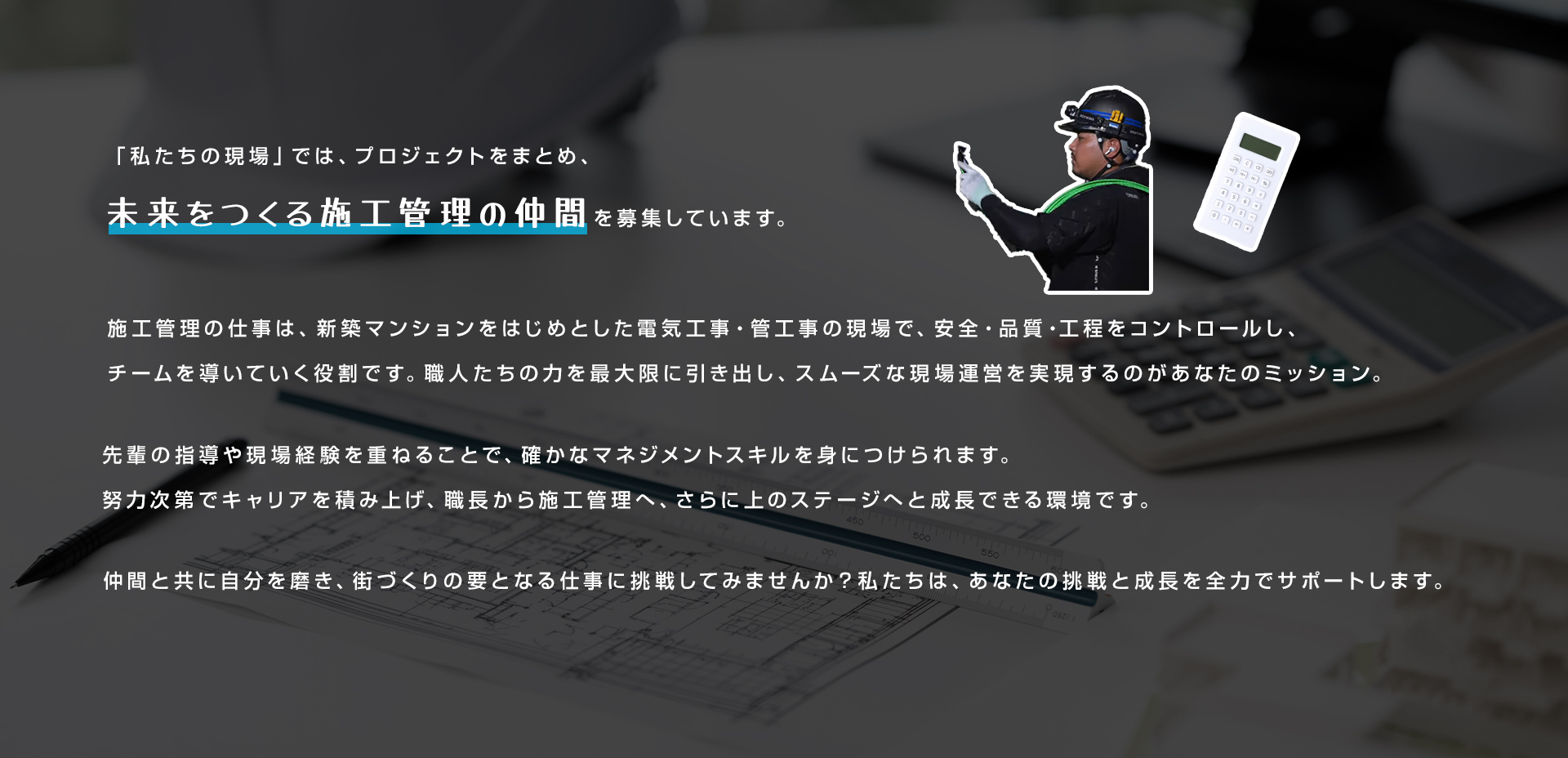 私たちは、新築マンションの電気工事・管工事の施工管理を手がけています。